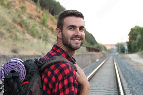 Single Man In Pink T Shirt Sitting On Train Tracks Shot Of Single