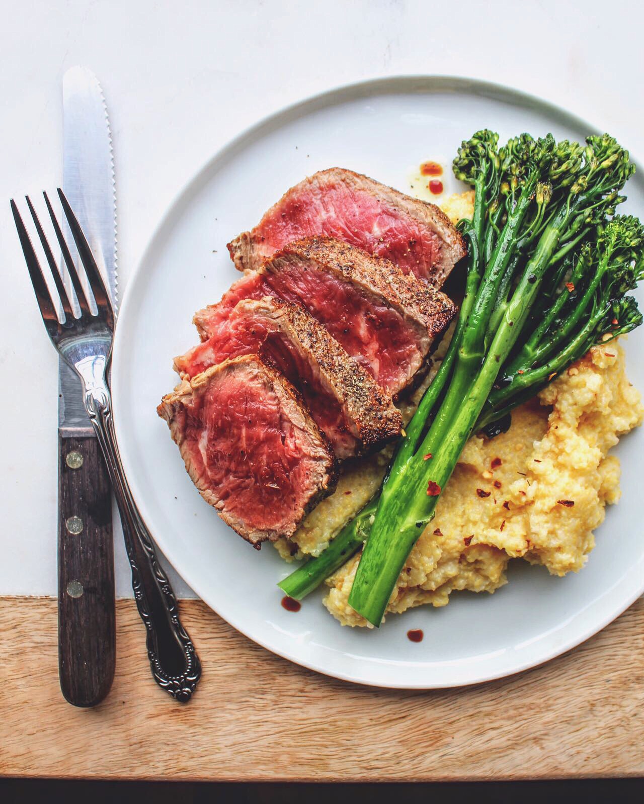 Melt the butter with the oil in a cast iron skillet set over medium high heat. Season steak with salt and pepper on both sides. Reduce heat to medium low and add balsamic vinegar and red wine. To develop a good sear leave the fillet to cook for 3 minutes on each side and do not move it at all.