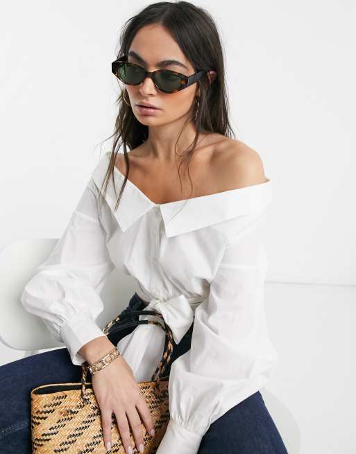 Asos Design Long Sleeve Off Shoulder Shirt With Tie Front In White