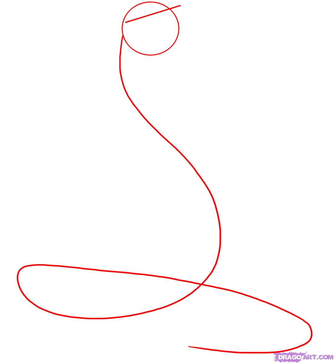 Heres another style you can copy to draw a cobra. First lets start off by drawing an oval circle. Trace two short lines at the front of the head for nostrils. Then draw a long squiggle line for the body frame.