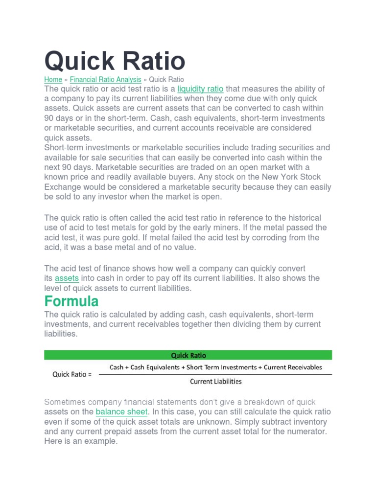 Quick Ratio Formula Definition Investinganswers