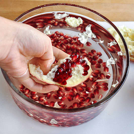 Now submerge your pomegranate pieces in the water and pop the seeds off. Flatten your hand and. At this point the pomegranate should come apart easily along the cuts you made in the fruit skin. Roll the pomegranate on your cutting board to loosen the seeds.