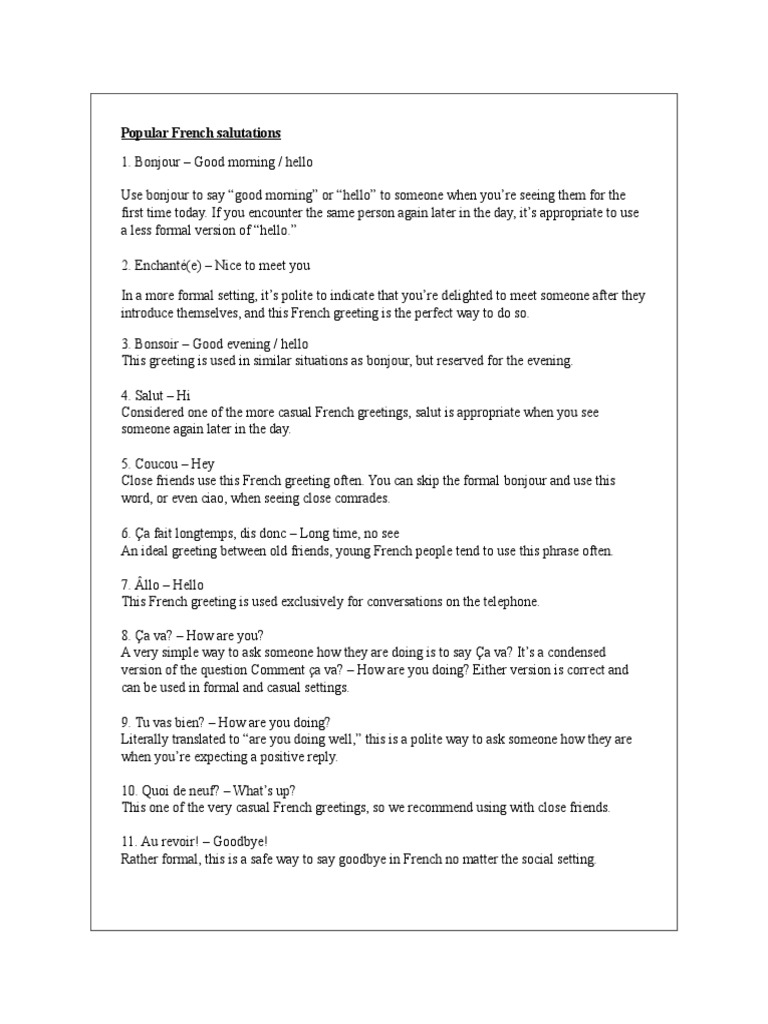 1 au revoir see you again this is the most common and most formal way of saying goodbye in french. Je men vais zhuh men ve a great way to let your friends know that youll get going is to say je men vais this french expression literally translates to i am leaving in english. And one of the main places in it is occupied by greetings and goodbyes. It is highly formal and it has a sense of finality.