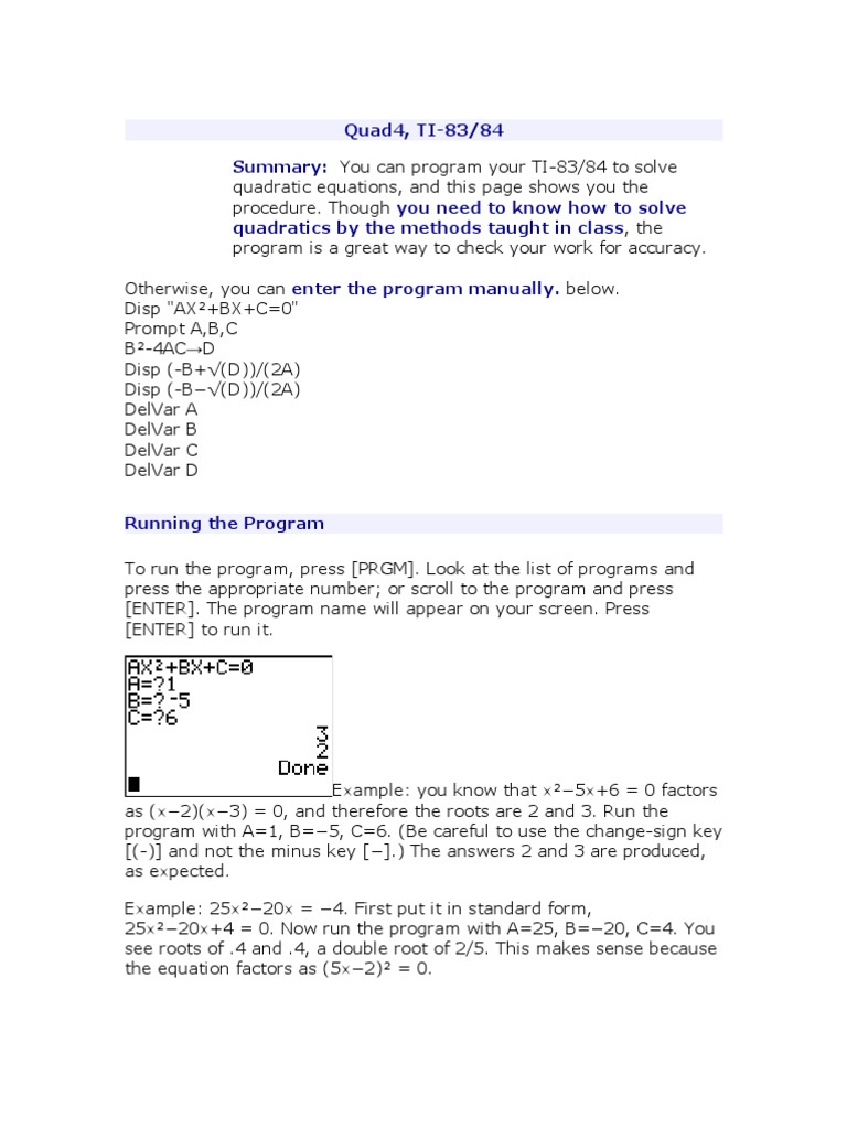 Quadratic Formula Program Ti 84 Walkthrough Code Quadratics