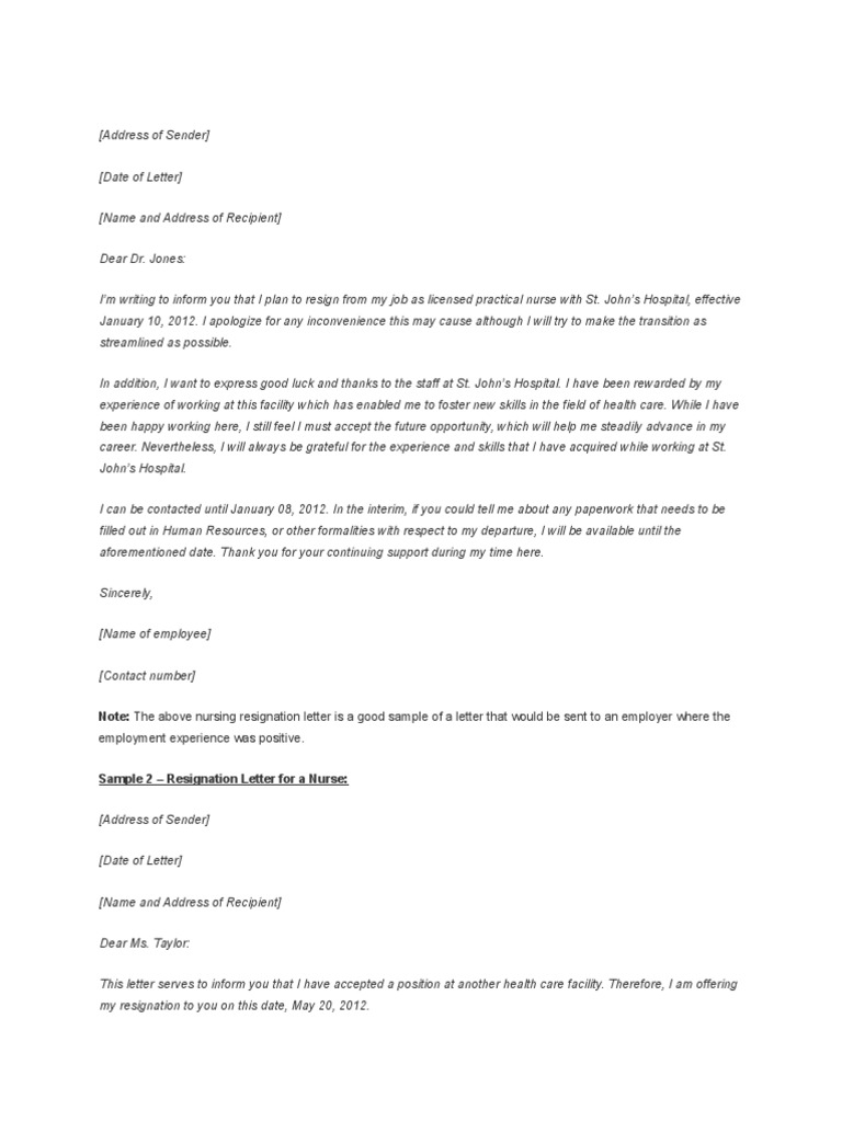Formal Resignation Letter Nurse Position Templates At